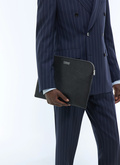 Ce porte-documents noir en cuir de vachette Saffiano, un cuir connu pour sa résistance, joue la carte de la sobriété maîtrisée. Son format compact, rehaussé d’un logo embossé argenté, accompagne avec justesse les tenues de bureau.